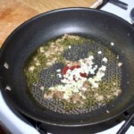 Na patelni rozgrzej oliwę, wrzuć anchois oraz czosnek, a następnie krótko podsmaż na małym ogniu.