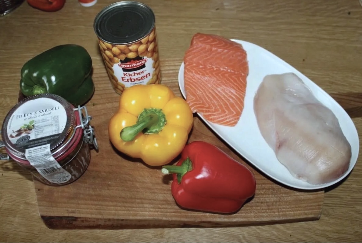 Warzywa: po 1 małej papryce (zielona, czerwona, żółta)
