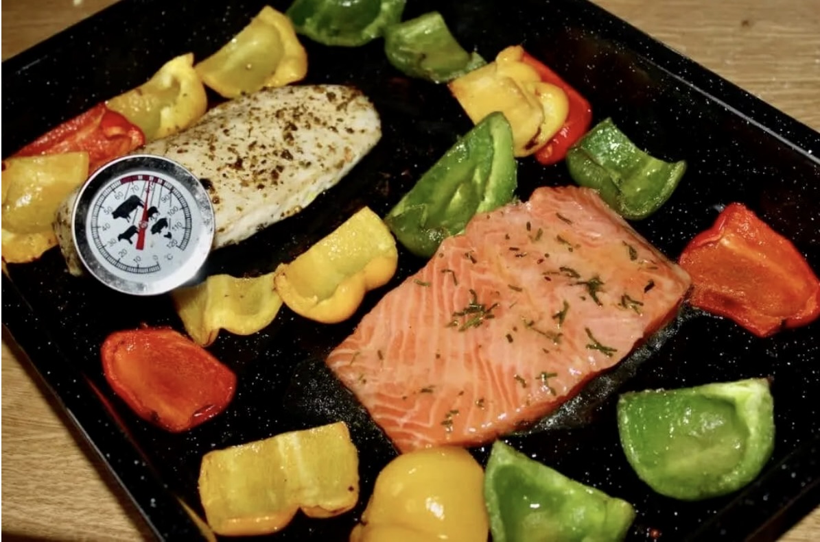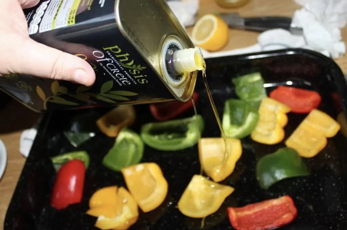 Pieczenie: Papryki pokrój na ćwiartki, usuń gniazda nasienne, osusz i przełóż do naczynia żaroodpornego. Skrop je oliwą i wymieszaj. Pomiędzy paprykami ułóż zamarynowanego łososia. Wstaw do piekarnika nagrzanego do 200°C na około 10–12 minut.