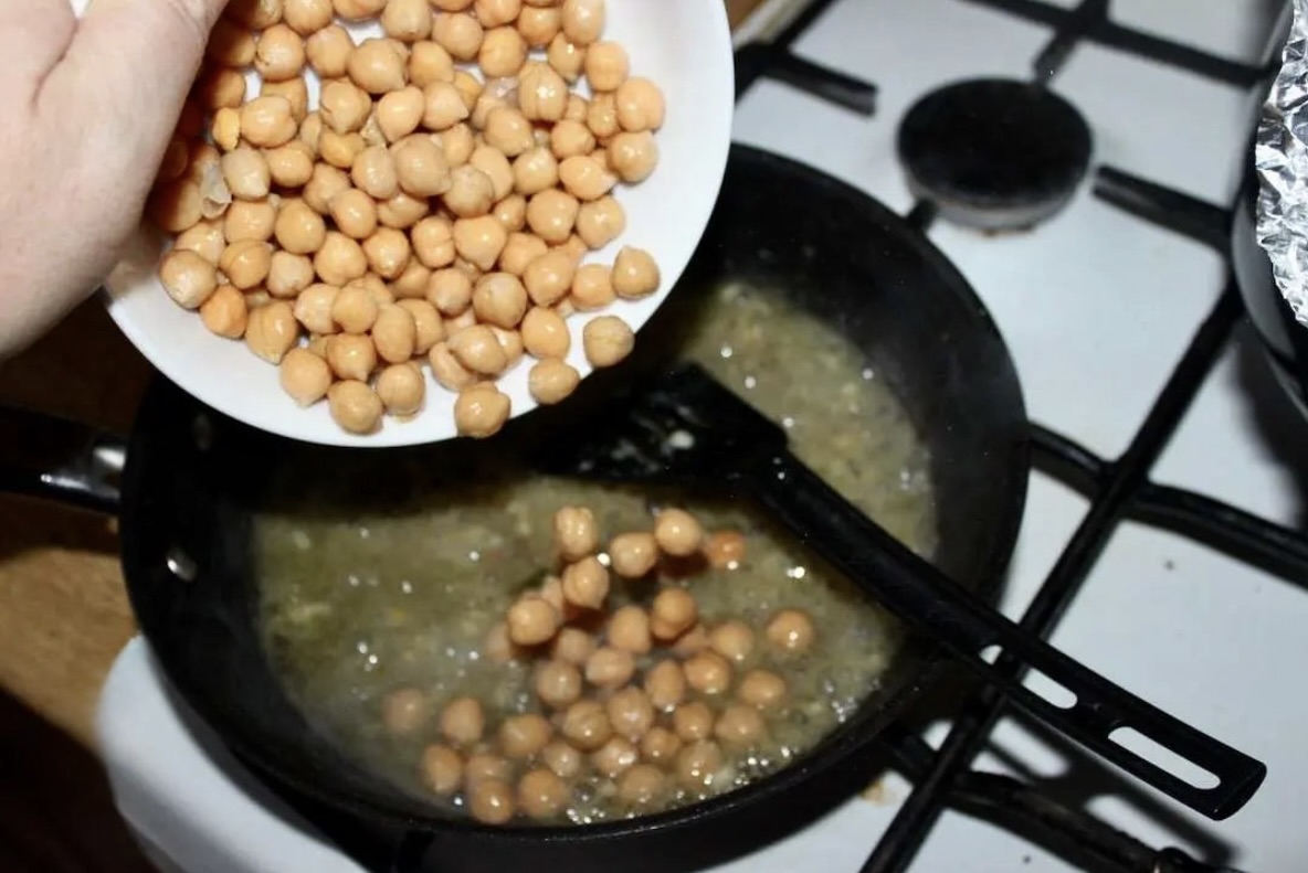 Na koniec wrzuć odcedzoną ciecierzycę. Smaż około minuty, aż sos dokładnie oblepi ziarna.