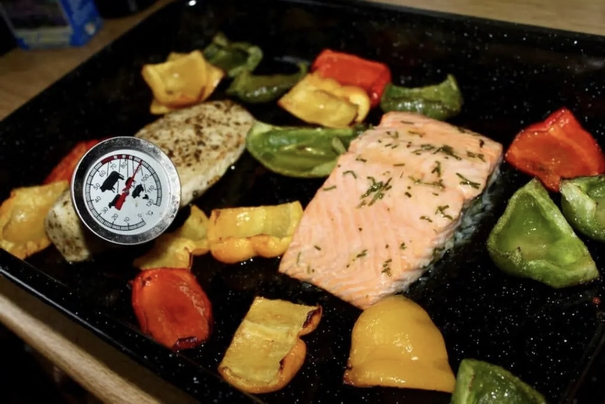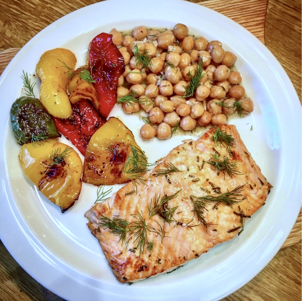 Upieczonego łososia podawaj od razu z pieczoną papryką i przygotowaną ciecierzycą. Danie jest kolorowe, zdrowe i bardzo aromatyczne.