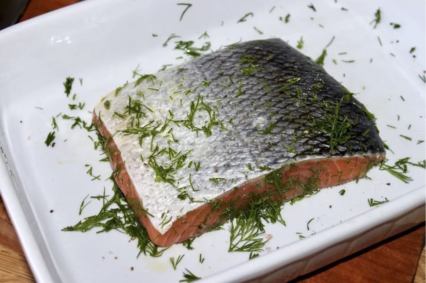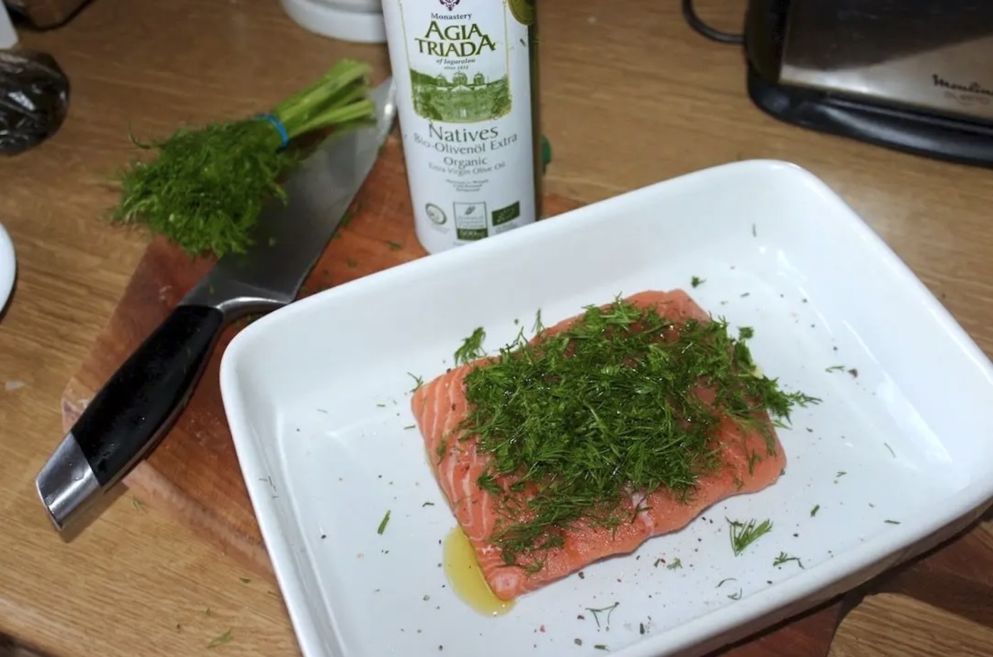Dodanie koperku: Posiekaj pęczek koperku i obficie nałóż go na rybę. Wmasuj oliwę i koperek w filet. Autor przepisu zaznacza, że koperku powinno być dużo, ponieważ podczas pieczenia traci on nieco aromatu.