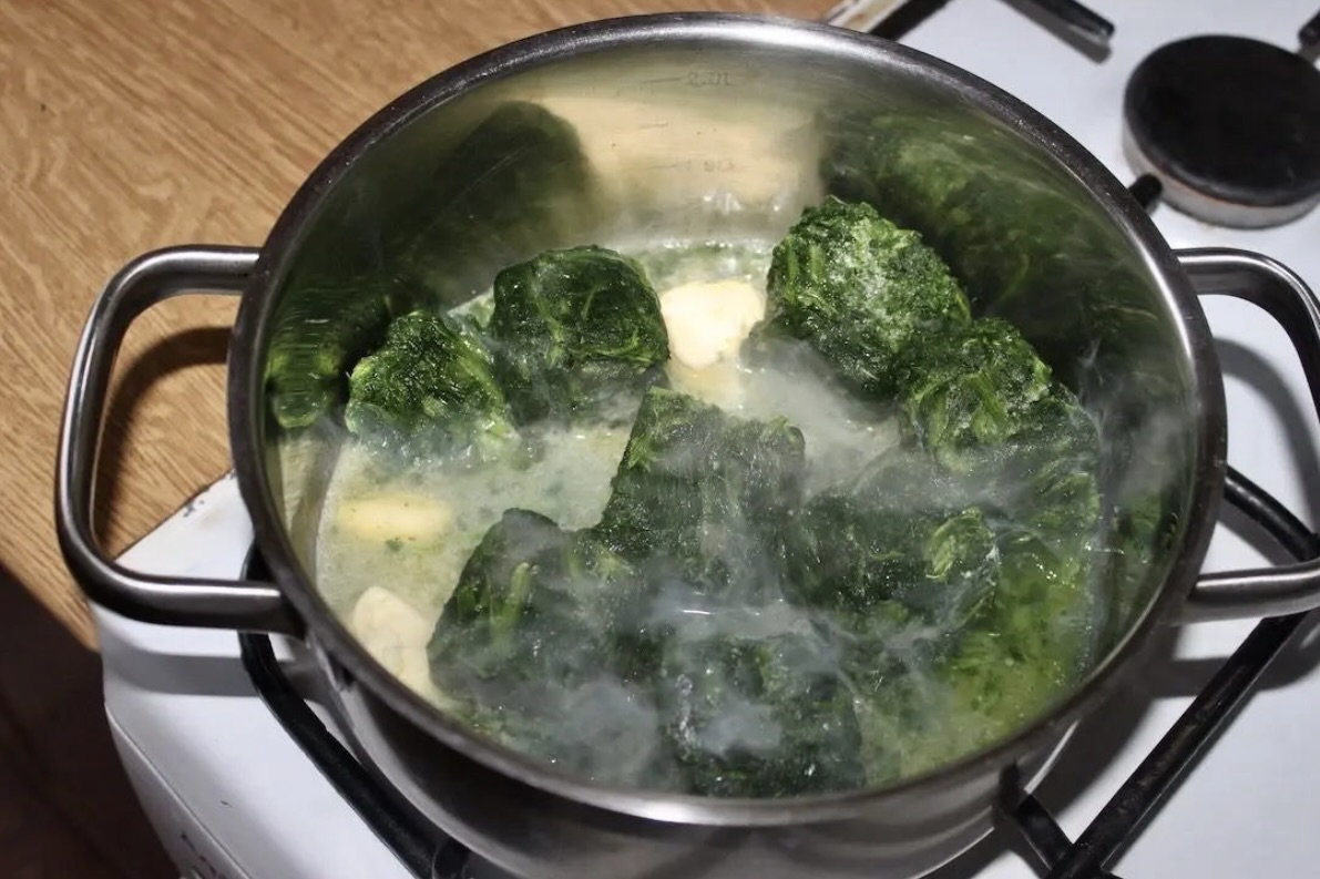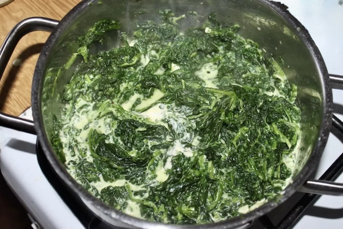 Dodaj szpinak i poczekaj, aż „zwiędnie” (w przypadku świeżego) lub odparuje woda (w przypadku mrożonego).