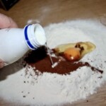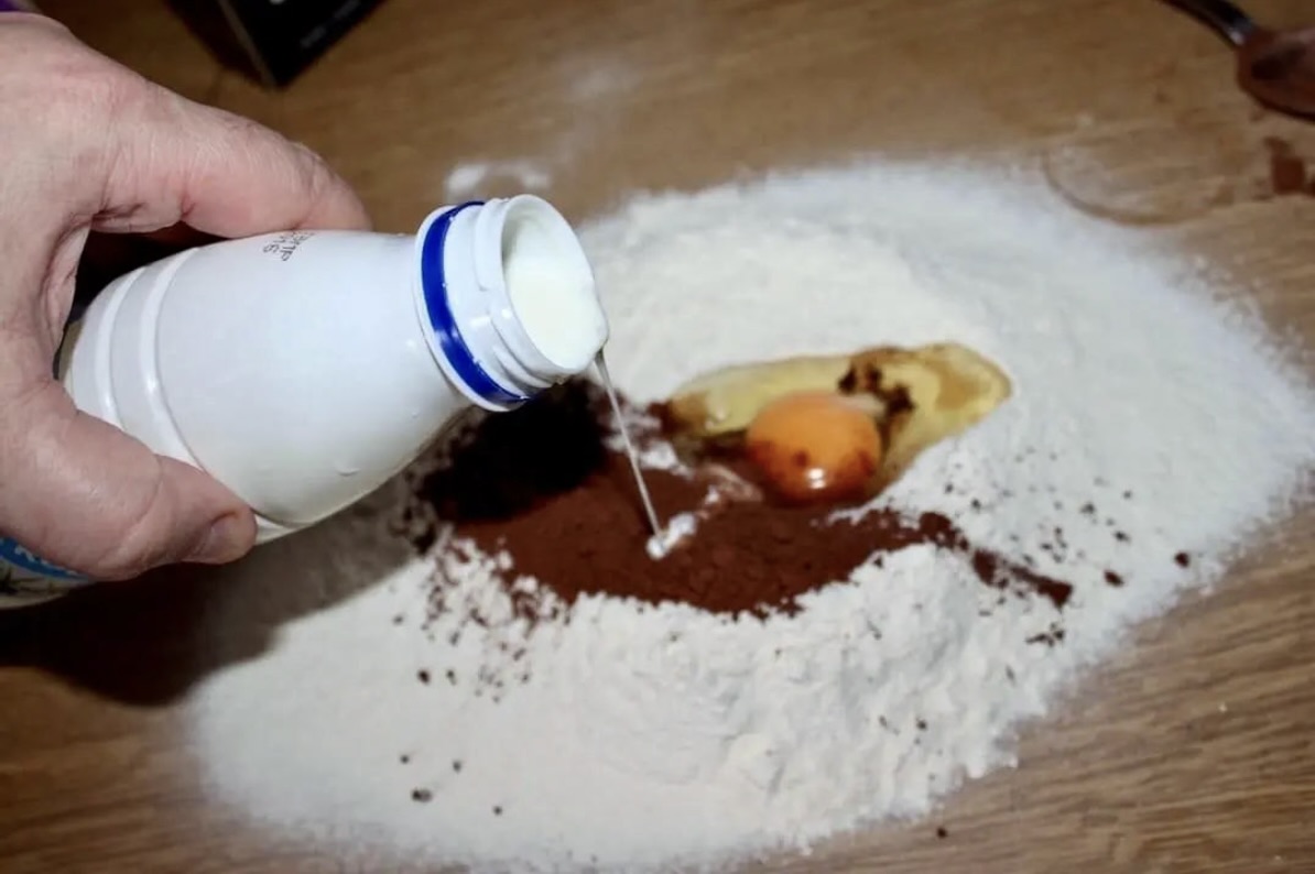 Mąkę przesiej na blat. Wbij jajko, dodaj kakao, sól oraz odrobinę maślanki (poprawi miękkość ciasta).