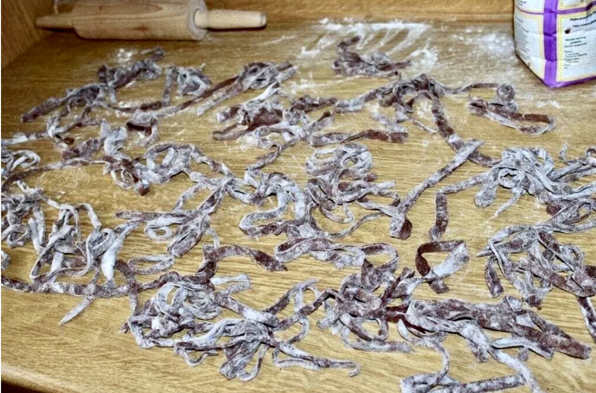 Pokrój na długie, cienkie paski (typu tagliatelle). Oprósz mąką, aby się nie posklejały.