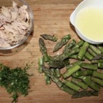Przygotowanie składników: Cytrynę przelej wrzącą wodą, zetrzyj z niej skórkę (bez białych fragmentów), a z reszty owocu wyciśnij sok. Umyj i posiekaj dymkę, obierz i posiekaj czosnek. Tuńczyka odsącz z nadmiaru oliwy, a natkę pietruszki posiekaj. Szparagi umyj i pokrój w kawałki podobnej wielkości do makaronu.