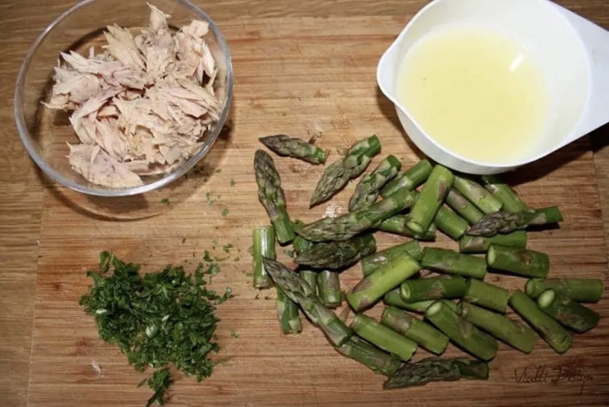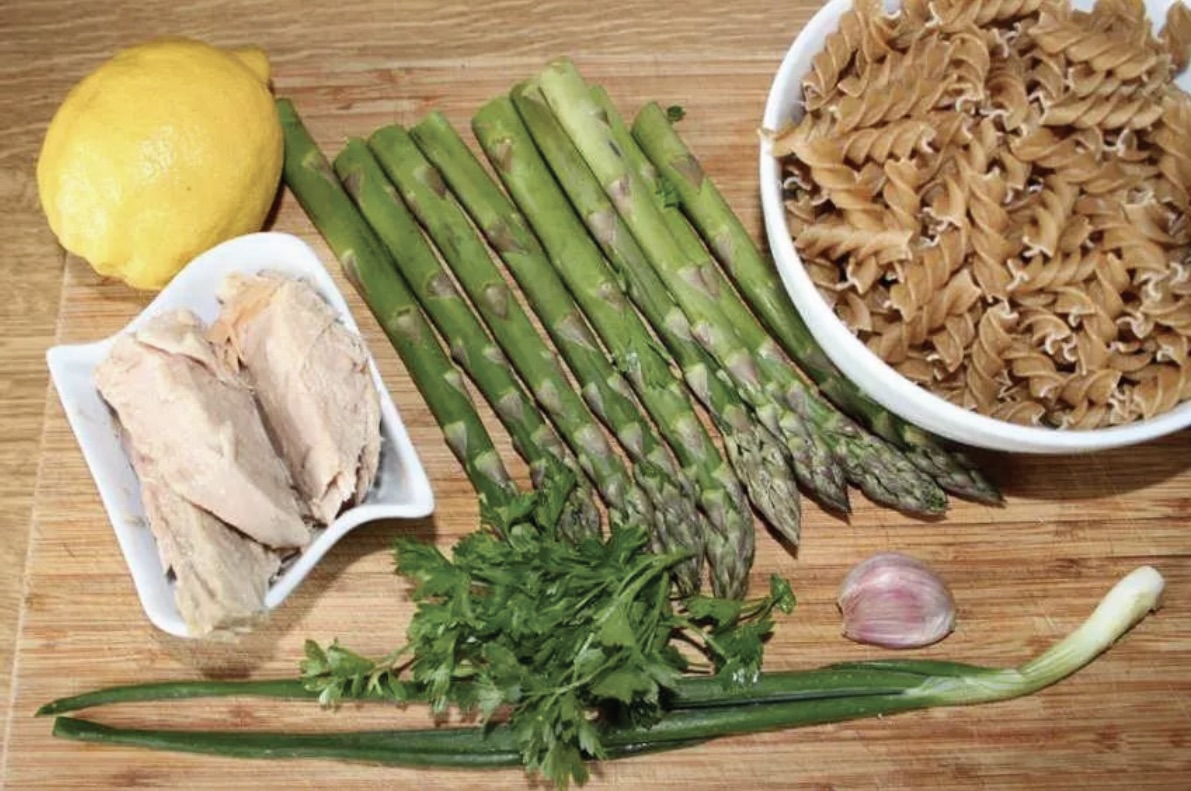 Przygotowanie składników: Cytrynę przelej wrzącą wodą, zetrzyj z niej skórkę (bez białych fragmentów), a z reszty owocu wyciśnij sok. Umyj i posiekaj dymkę, obierz i posiekaj czosnek. Tuńczyka odsącz z nadmiaru oliwy, a natkę pietruszki posiekaj. Szparagi umyj i pokrój w kawałki podobnej wielkości do makaronu.