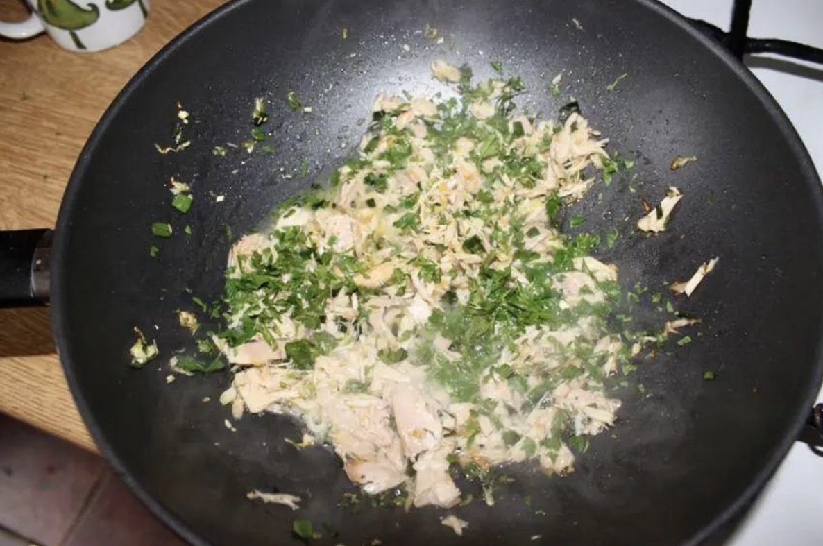 Dodanie tuńczyka: Następnie dodaj na patelnię odsączonego tuńczyka i posiekaną natkę pietruszki. Smaż przez kolejne 30 sekund.
