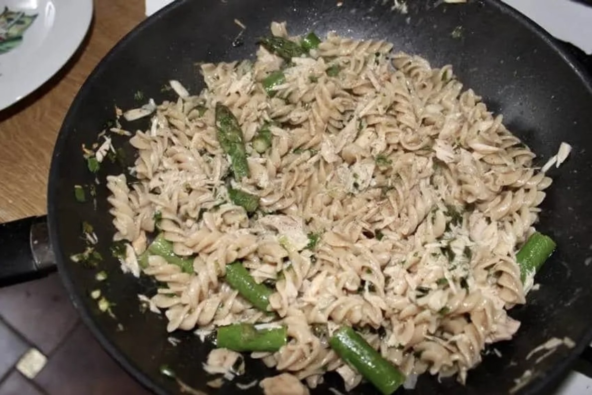 Łączenie składników: Makaron ze szparagami odcedź, a następnie przełóż prosto na patelnię z tuńczykiem.