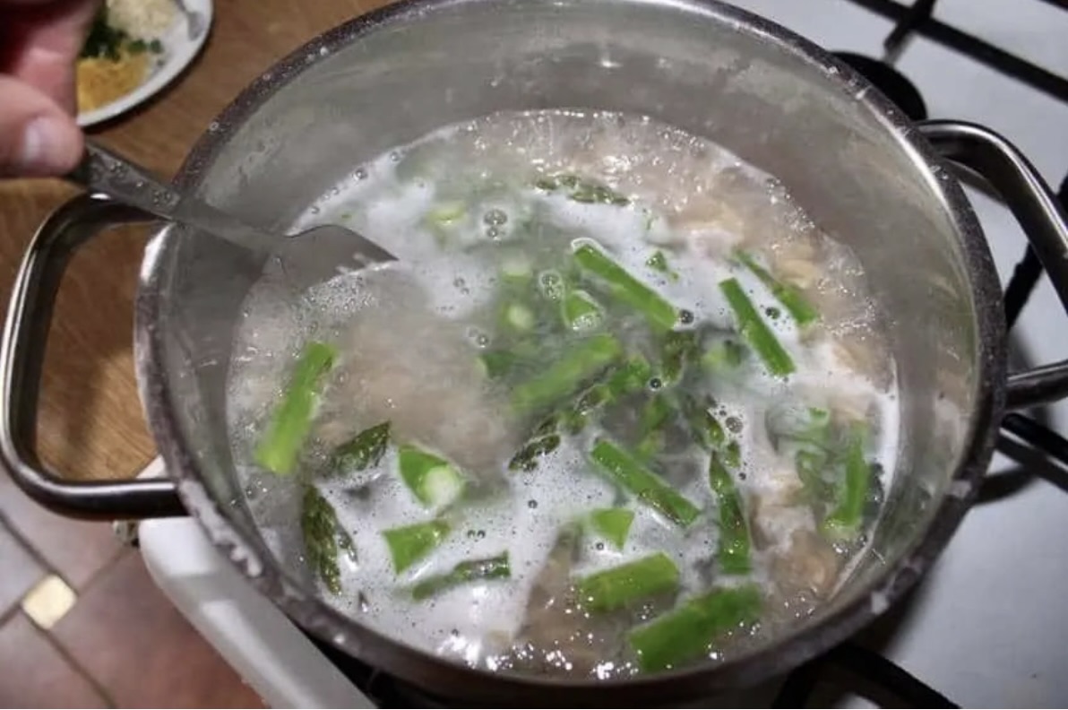 Dodanie szparagów: Dwie minuty przed końcem gotowania makaronu wrzuć do garnka pokrojone szparagi.