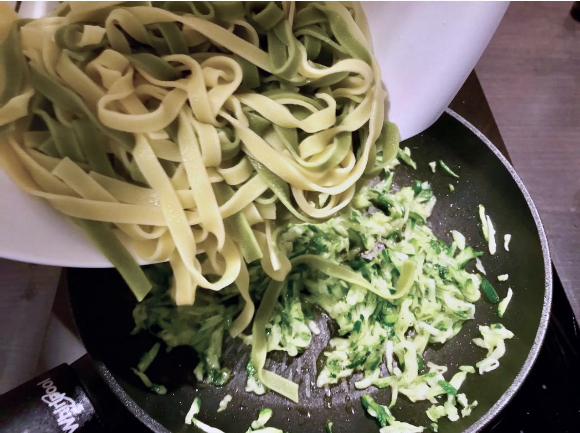 Odcedzony makaron wrzuć na patelnię do cukinii.