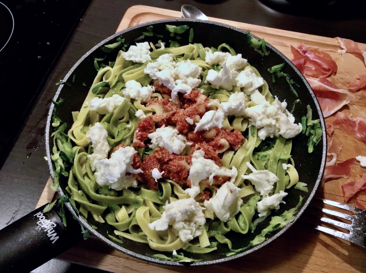 Zdejmij patelnię z ognia. Od razu dodaj porwaną w palcach mozzarellę i wymieszaj – ser powinien zacząć się topić, a figi pod wpływem ciepła stworzyć kremowy sos oblepiający makaron.