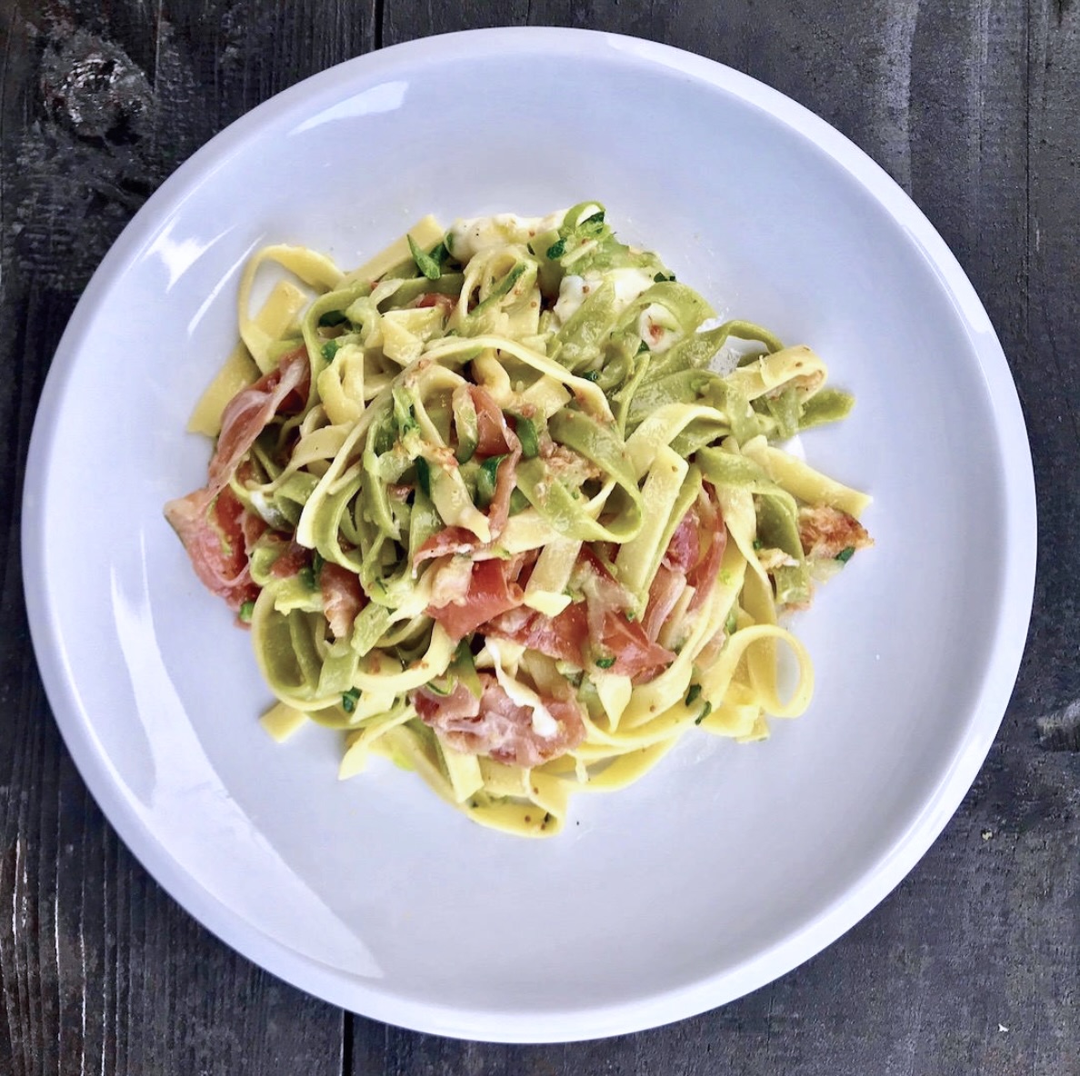 Na samym końcu dodaj poszarpaną szynkę dojrzewającą, krótko wymieszaj i podawaj natychmiast.