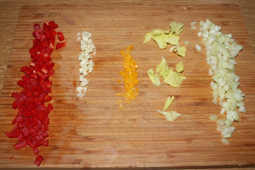Przygotuj składniki dania: mały kawałek czerwonej papryki pokrojonej w drobną kosteczkę, 1 ząbek czosnku obrany i drobno posiekany, 1 żółtą papryczkę chili drobno posiekaną, 1 łodygę selera naciowego drobno posiekaną, listki selera naciowego.