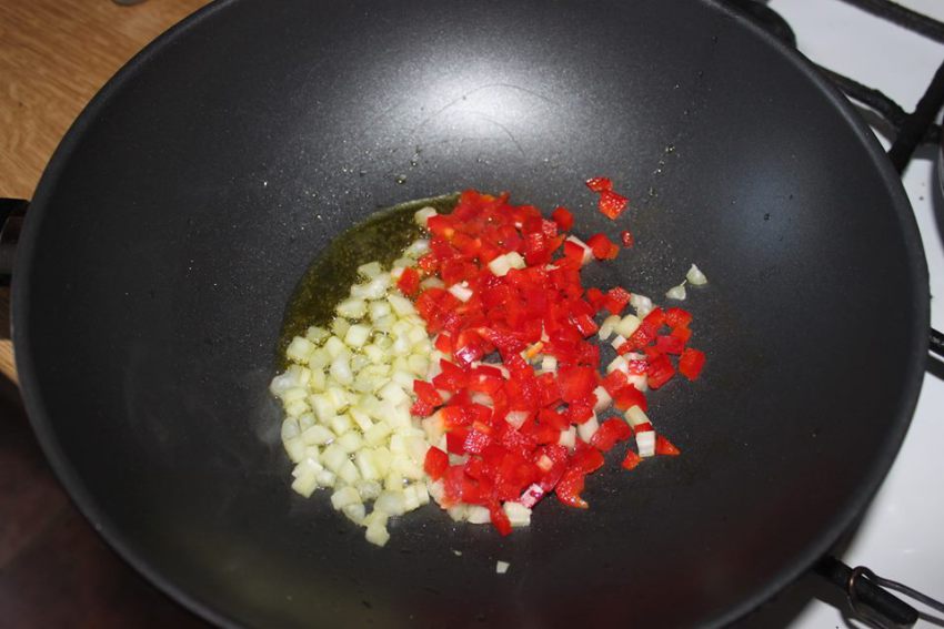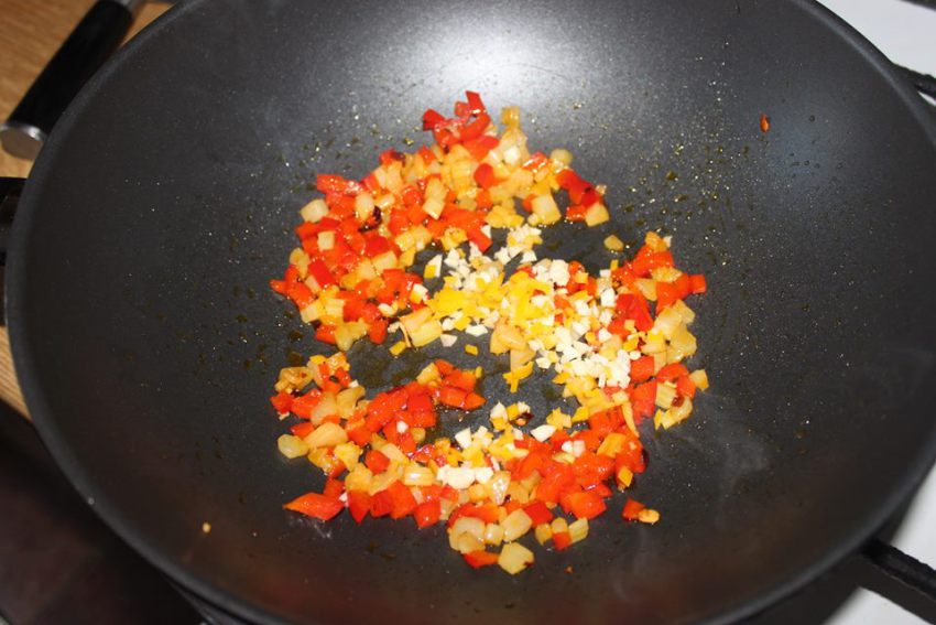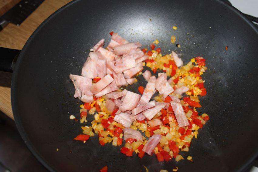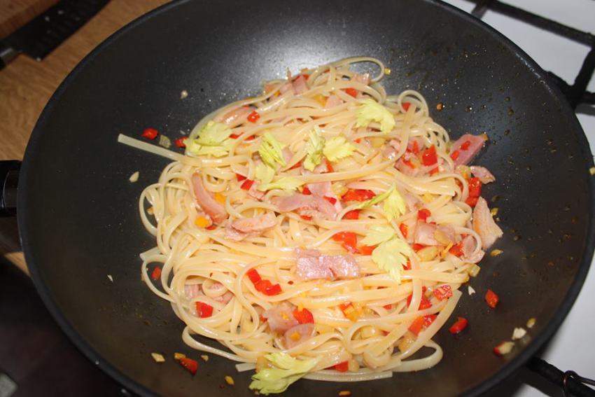 Na patelni rozgrzej niewielką ilość oliwy, a następnie wrzuć słodką paprykę i seler naciowy. Smaż około 1 minuty mieszając od czasu do czasu. Po tym czasie wrzuć na patelnię czosnek i papryczkę chili i smaż wszystko 30 sekund. Dodaj golonkę i smaż krótko, aby mięso jedynie się podgrzało. Dwie minuty na średnim ogniu powinny wystarczyć.