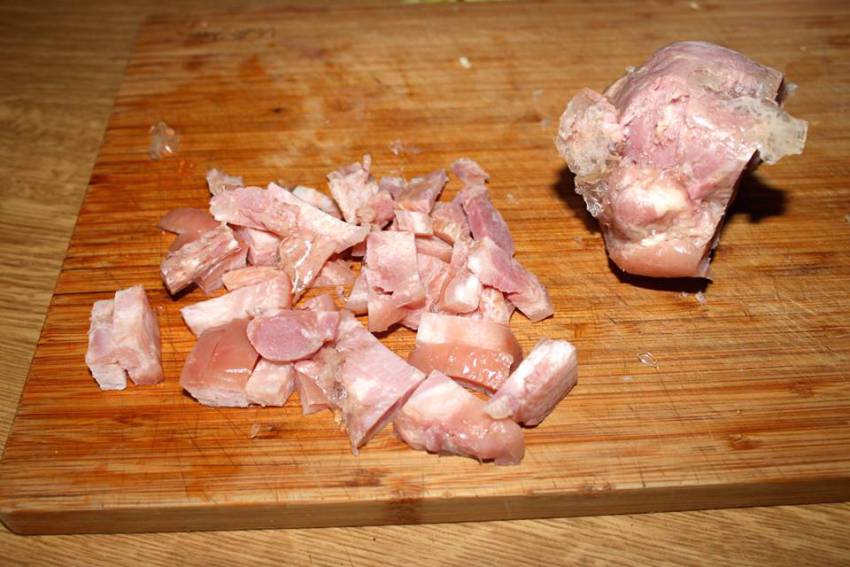 Pokrój golonkę w nieduże paseczki. Ile potrzeba golonki? Tyle, ile uważasz. Pamiętaj, że to danie makaronowe, więc golonka ma jedynie wzbogacić smak, a nie zdominować danie. Z drugiej strony to makaron z golonką, nie musisz oszczędzać na mięsie.