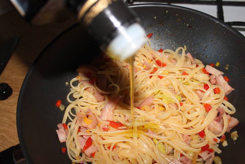 Makaron z golonką to danie, które powstało spontanicznie. Użyłem do niego składników, które akurat miałem pod ręką. Nie wiedzieć skąd znalazła się tam również golonka, taka gotowa, ze sklepu. I powiem krótko, danie wyszło absolutnie znakomicie. Oczywiście przeciwników golonki pewnie nie przekonam, ale co tam. Za tym fanów golonki do tego dania przekonywać nie muszę, to pozycja obowiązkowa dla Was. Golonka w tym przypadku nadała daniu znakomitego smaku, choć zapewne pieczona lub gotowana samodzielnie będzie znacznie lepszym dodatkiem. Tak, czy siak ważne, aby nie smażyć jej za długo.