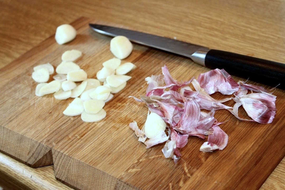 Obierz i pokrój w plasterki 4-5 ząbków czosnku.