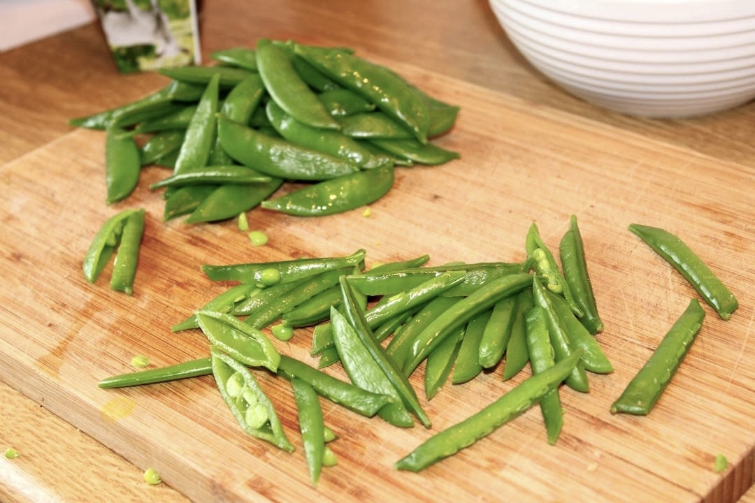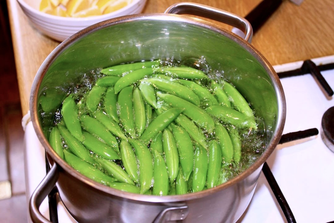 Groszek cukrowy dobrze opłucz. Wrzuć go na wrzącą, lekko osoloną wodę. Gotuj 2 minuty, odcedź, a następnie przelej zimną wodą. Opcjonalnie: przekrój groszek wzdłuż na połowę.