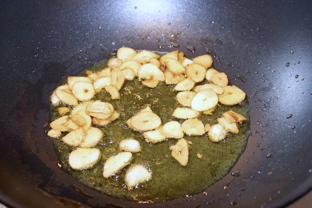 Na patelni rozgrzej oliwę do średniej temperatury i wrzuć czosnek. Smaż krótko, aby lekko zbrązowiał (uwaga: nie może być gorzki!). Wyłóż czosnek na ręcznik papierowy.