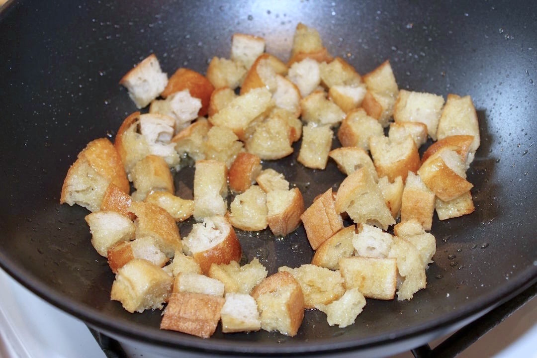 Na pozostałą oliwę wrzuć pokrojony chleb, a następnie smaż krótko, aż uzyskasz chrupiące grzanki. Również wyłóż je na ręcznik papierowy.