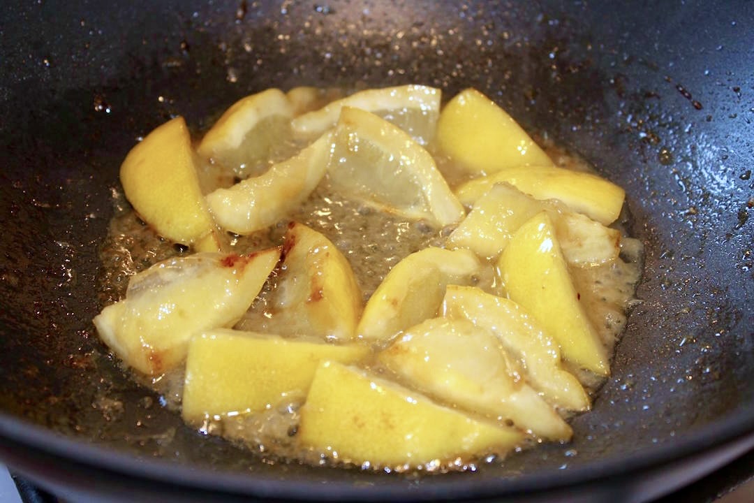 Dolej nieco oliwy na patelnię i wrzuć kawałki cytryny. Smaż ją około 4 minut na średnim ogniu, aż zacznie lekko brązowieć i puści sok.
