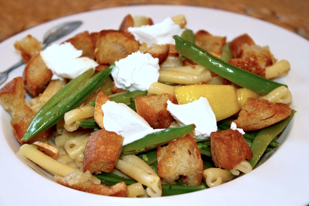 Makaron z groszkiem posyp grzankami, a na wierzchu rozłóż kilka kawałków miękkiego, koziego serka.