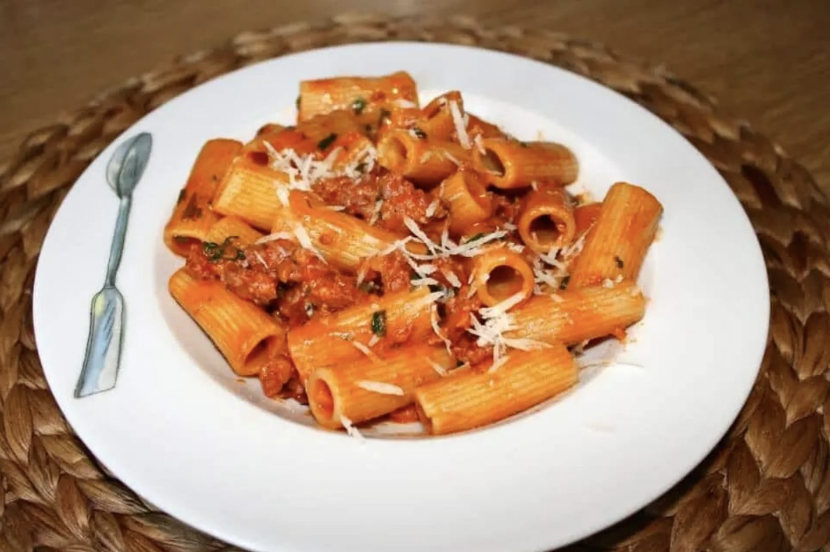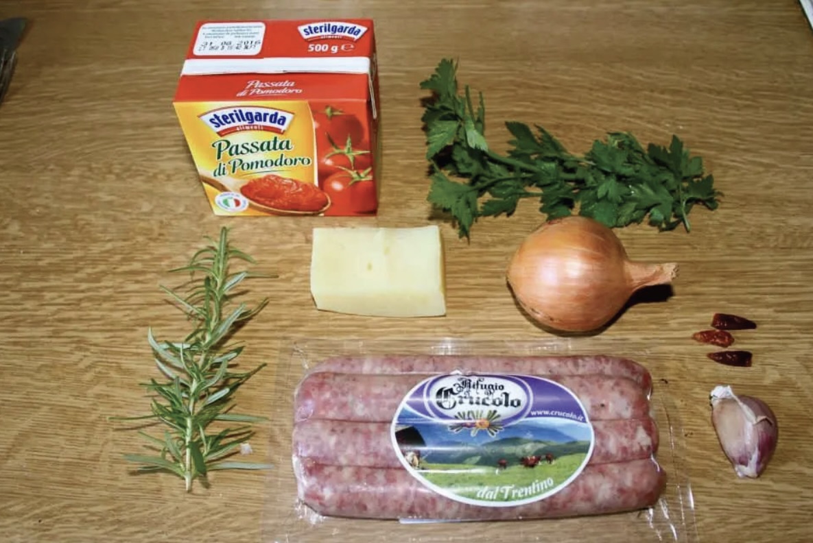 Makaron z kiełbasą doskonale wkomponowaną w pyszny sos pomidorowy to bardzo smaczne i sycące danie. Danie idealne na każdą porę roku, ale szczególnie na chłodniejsze dni. Do przygotowania tego dania użyłem przywiezionej niedawno z zagranicznych wojaży włoskiej, surowej kiełbasy z Trentino. Jeśli jej nie dostaniesz (łatwo nie będzie) użyj naszej białej, surowej kiełbasy. Zamiast rigatoni możesz użyć makaronu penne, też będzie pasował. Bez względu na to, jakiego makaronu użyjesz to wiedz, że ten makaron z kiełbasą Cię po prostu zachwyci.