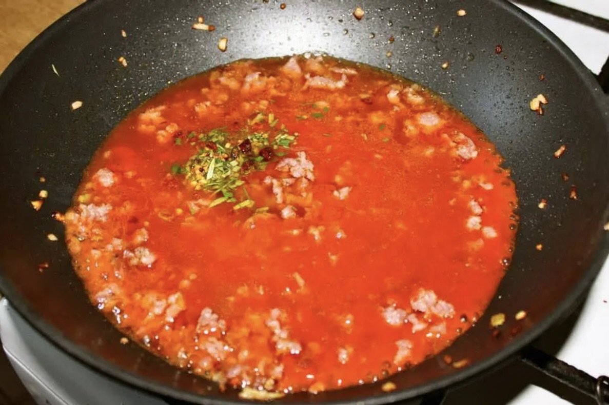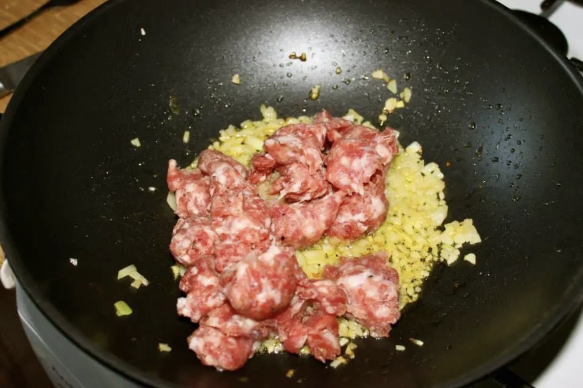 Mięso: Kiełbasę wyjmij z jelita i dodaj na patelnię. Rozdrobnij ją widelcem i smaż kilka minut, aż mięso zbrązowieje.