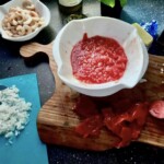 Przygotowanie składników: Krewetki rozmroź, umyj i dobrze osusz ręcznikami papierowymi. Pomidory zetrzyj na grubych oczkach tarki. Cebulę obierz i drobno posiekaj w kostkę.