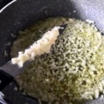 Smażenie bazy: Na patelnię wlej nieco oliwy i wrzuć łyżkę masła. Zanim masło się stopi, dodaj cebulę. Gdy cebula się zeszkli, dorzuć drobno posiekany czosnek i smaż przez około 1 minutę.