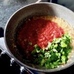 Przygotowanie sosu: Wrzuć na patelnię starte pomidory, a także porwane listki większości pęczka bazylii. Dodaj płatki chilli (ok. pół łyżeczki) oraz 1 lub 2 łyżki kaparów. Dopraw całość solą morską, uważając, by nie przesolić (kapary są słone).