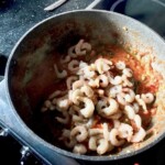 Dodanie krewetek: Wrzuć krewetki na patelnię z sosem.