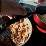 Łączenie: Wlej do sosu 3 łyżki wody z gotowania makaronu. Gotuj sos z krewetkami przez około 2 minuty, aż woda odparuje, a krewetki się dogotują.