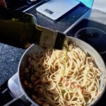 Mieszanie z makaronem: Odcedź ugotowany al dente makaron i wrzuć go na patelnię z sosem. Wlej około 1 łyżki oliwy extra vergine. Na koniec dodaj pozostałe porwane liście świeżej bazylii.