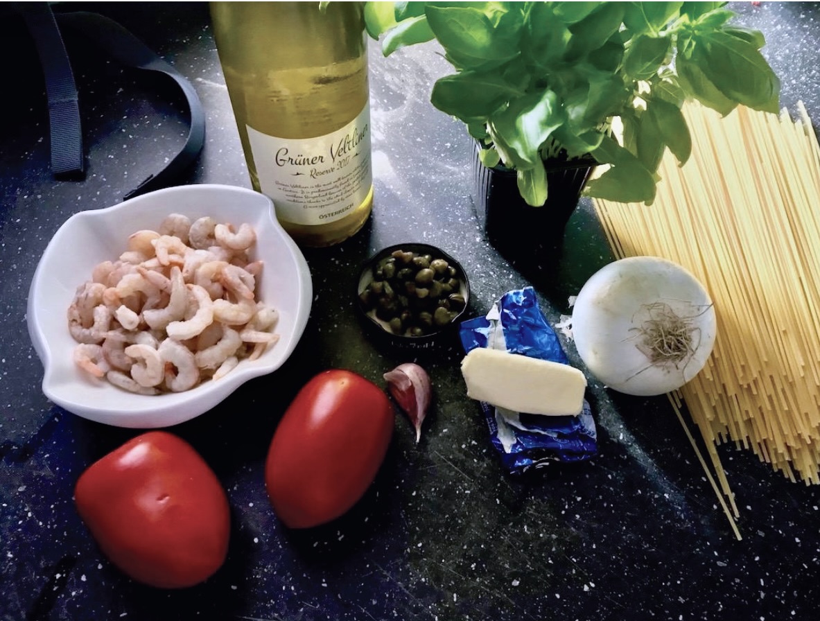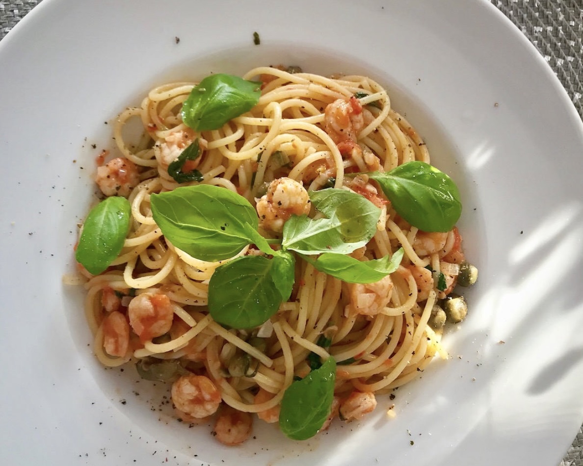 Makaron z krewetkami jest daniem prostym i wyjątkowo smacznym. Przedstawiam uproszczoną wersję dania, bowiem nie zawsze mamy w zasięgu surowe krewetki, które byłyby najlepsze do tego dania. Pokażę Ci, że użycie podgotowanych, takich nieco większych od koktajlowych krewetek również ma sens, a całość może smakować wybornie. Pomidory wzbogacone bazylią i kaparami znakomicie nadadzą smak daniu, dzięki czemu nawet nie poczujesz, że brakuje Ci surowych krewetek. W tym daniu najlepszym wyborem jeśli chodzi o makaron będzie spaghetti.