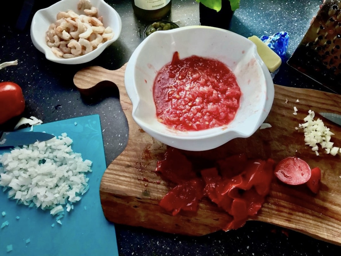 Przygotowanie składników: Krewetki rozmroź, umyj i dobrze osusz ręcznikami papierowymi. Pomidory zetrzyj na grubych oczkach tarki. Cebulę obierz i drobno posiekaj w kostkę.