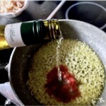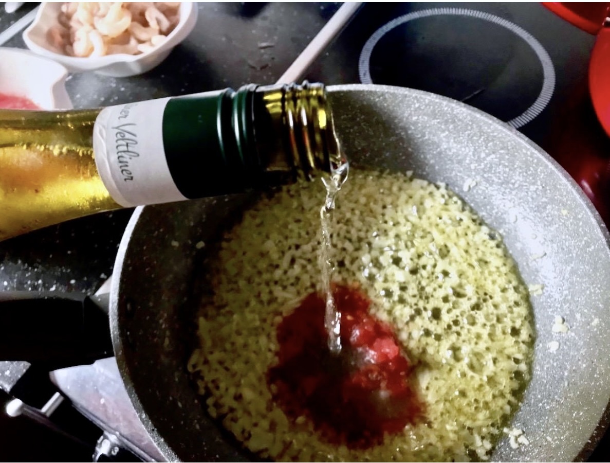 Dodanie wina: Wlej mały kieliszek białego wina i zwiększ gaz. Smaż dalej przez około 1 minutę, aby wino odparowało.