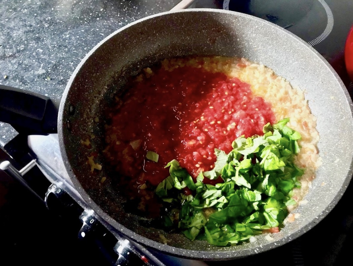 Przygotowanie sosu: Wrzuć na patelnię starte pomidory, a także porwane listki większości pęczka bazylii. Dodaj płatki chilli (ok. pół łyżeczki) oraz 1 lub 2 łyżki kaparów. Dopraw całość solą morską, uważając, by nie przesolić (kapary są słone).