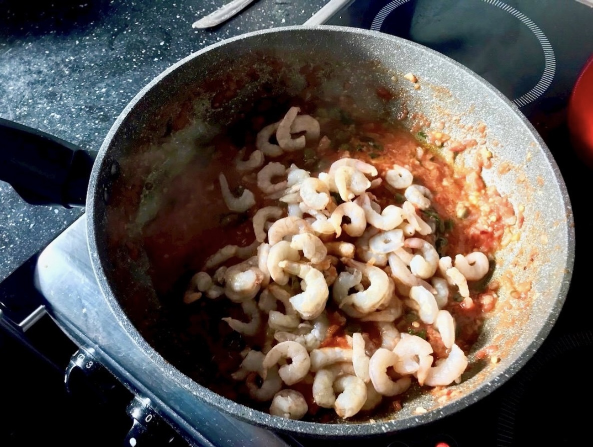 Dodanie krewetek: Wrzuć krewetki na patelnię z sosem.