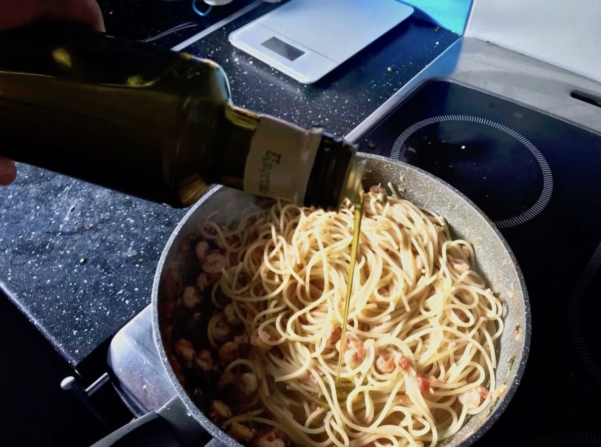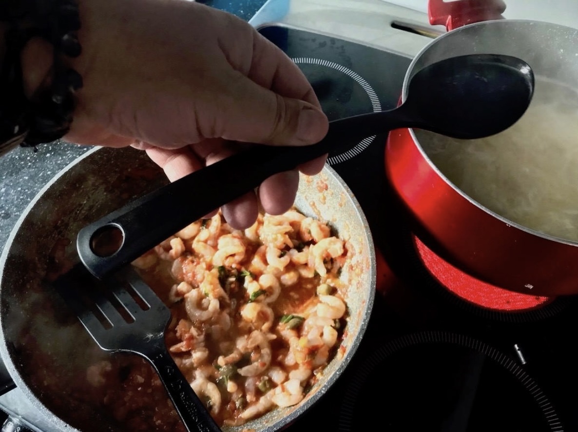Łączenie: Wlej do sosu 3 łyżki wody z gotowania makaronu. Gotuj sos z krewetkami przez około 2 minuty, aż woda odparuje, a krewetki się dogotują.