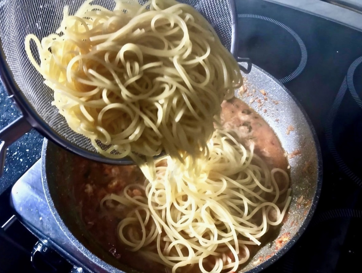 Mieszanie z makaronem: Odcedź ugotowany al dente makaron i wrzuć go na patelnię z sosem. Wlej około 1 łyżki oliwy extra vergine. Na koniec dodaj pozostałe porwane liście świeżej bazylii.