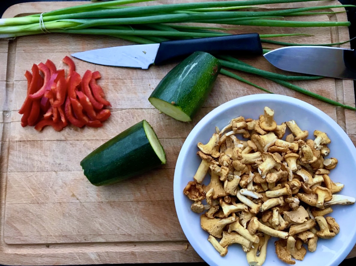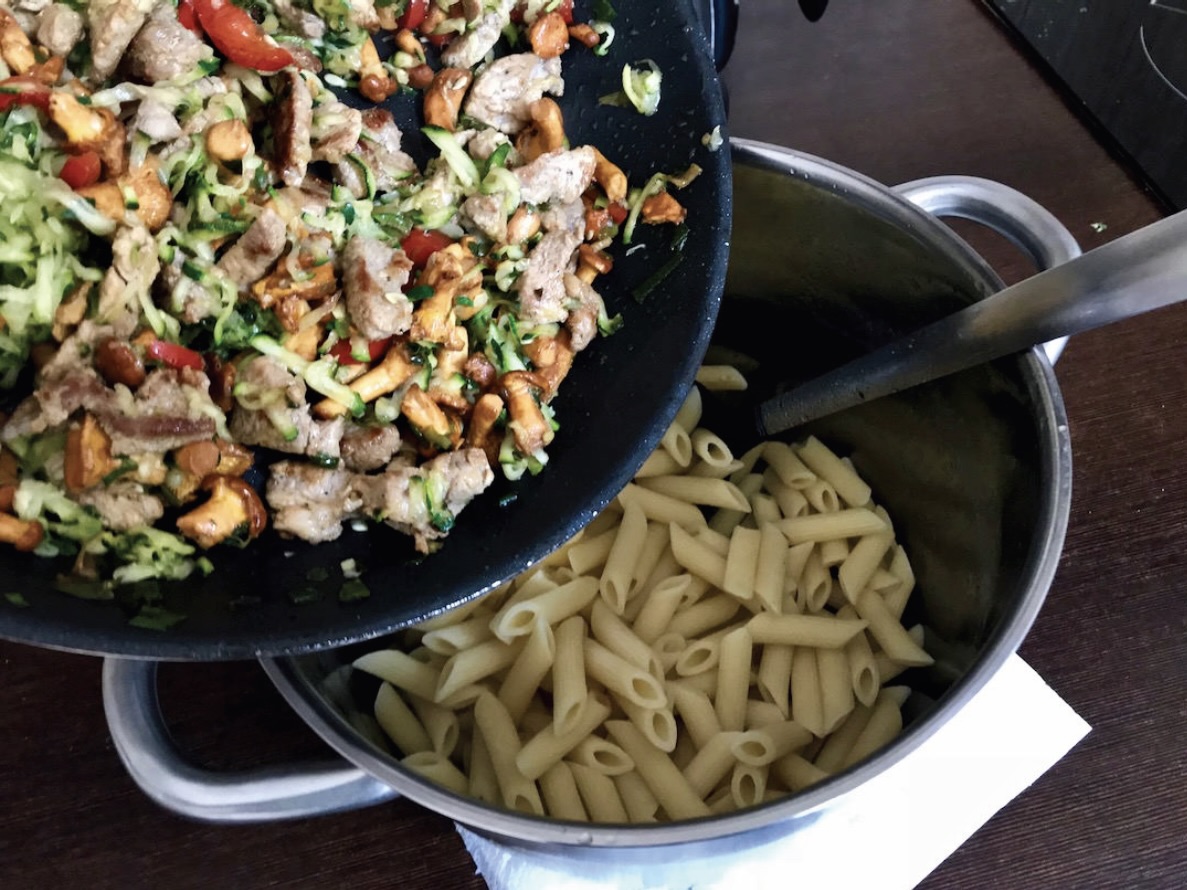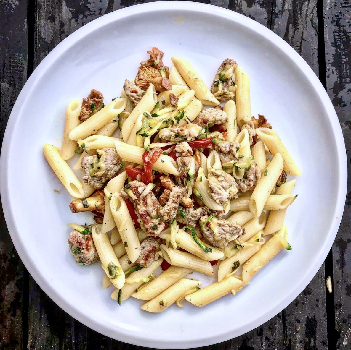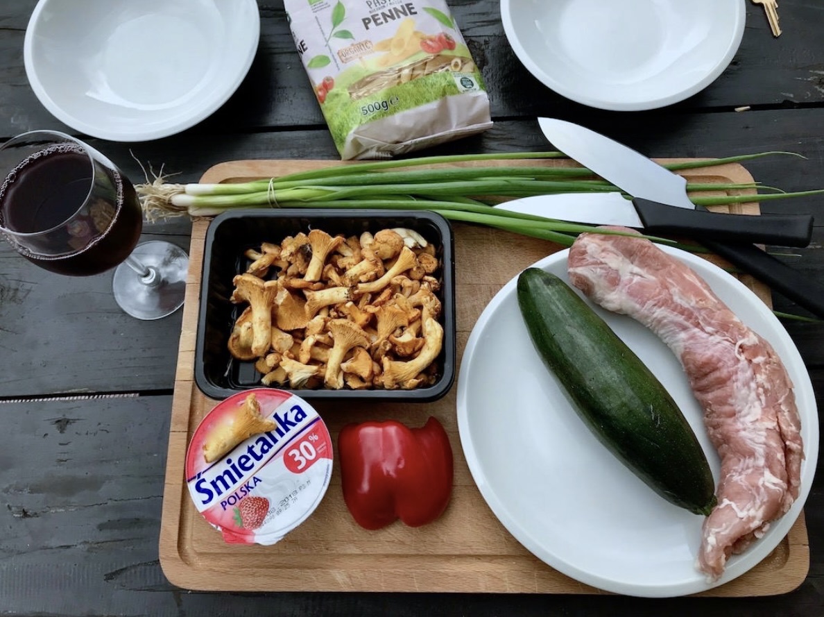 Makaron z kurkami to fajne danie sezonowe. Latem, gdy wspaniale pachnących lasem grzybów leśnych kurek zwykle nie brakuje kombinujemy, jakie nowe danie z nimi można przygotować. Ten przepis to moja propozycja. Może nie jakaś specjalnie odkrywcza, ale zapewniam, że smakuje świetnie. Daniem kieruje prosta zasada, by polędwiczkę wieprzową i kurki smażyć ledwie kilka minut, gdyż potem twardnieją. Grzybów też nigdy specjalnie nie czyszczę. Wolę, gdy coś mi chrzęści pod zębem, aniżeli wypłukać smak grzyba obfitym strumieniem wody. Na żmudne czyszczenie grzybów pędzelkiem nie mam ochoty. Kuchnia to nie laboratorium. Kuchnia to smak. Tu jest go mnóstwo. Makaron z pachnącymi lasem grzybami rządzi.