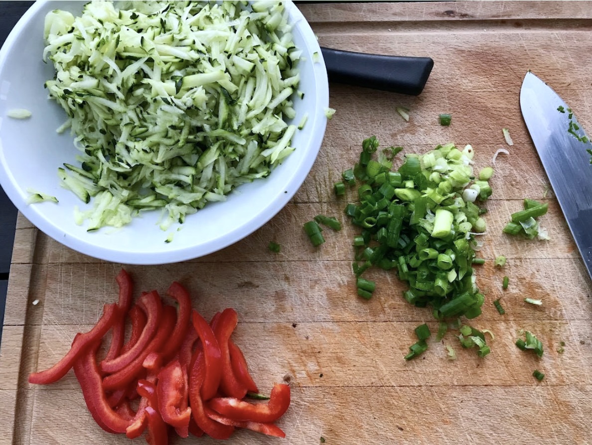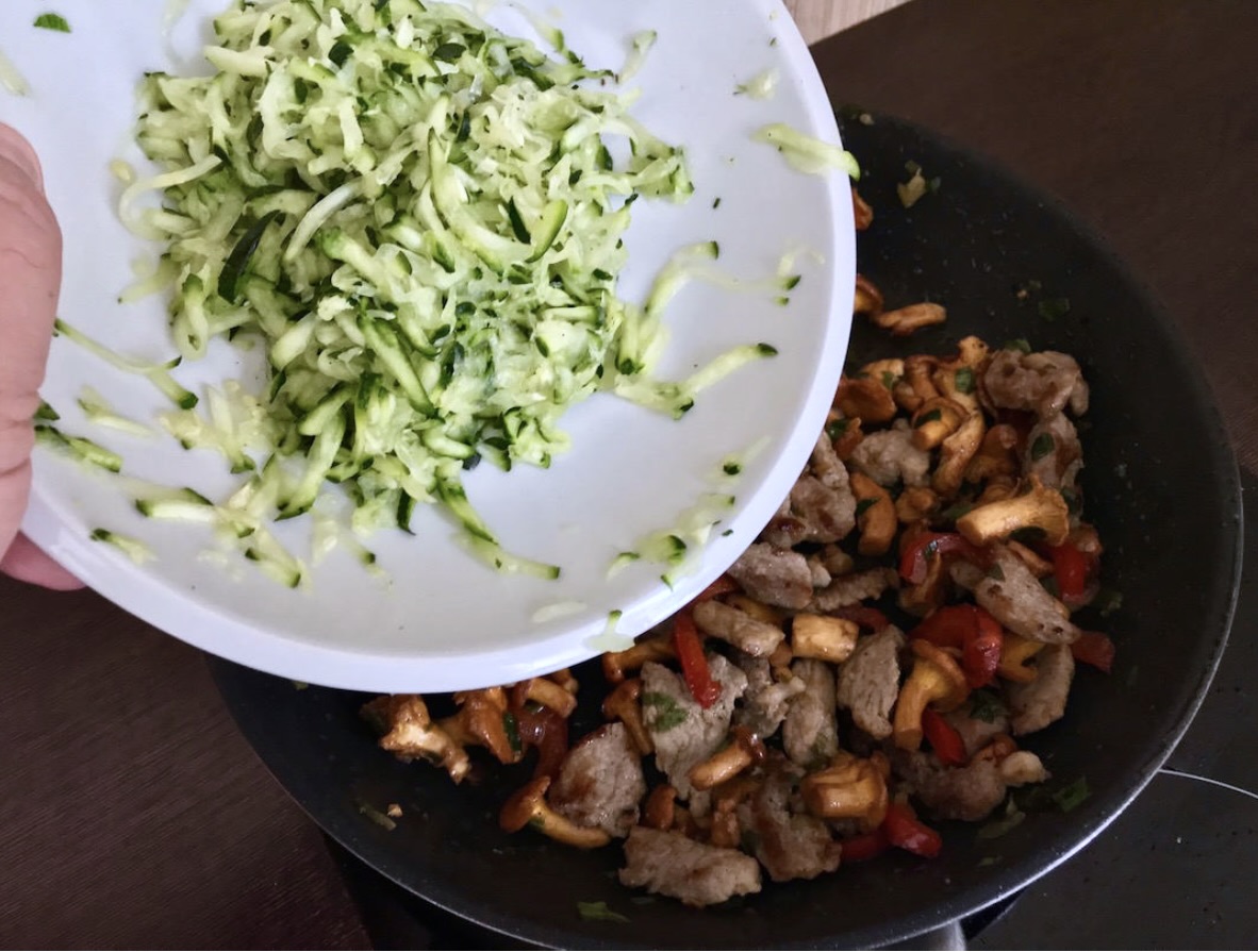Bardzo dobrze odciśnij wodę z wcześniej startej i osolonej cukinii i wrzuć ją na patelnię. Szybko zamieszaj całość.