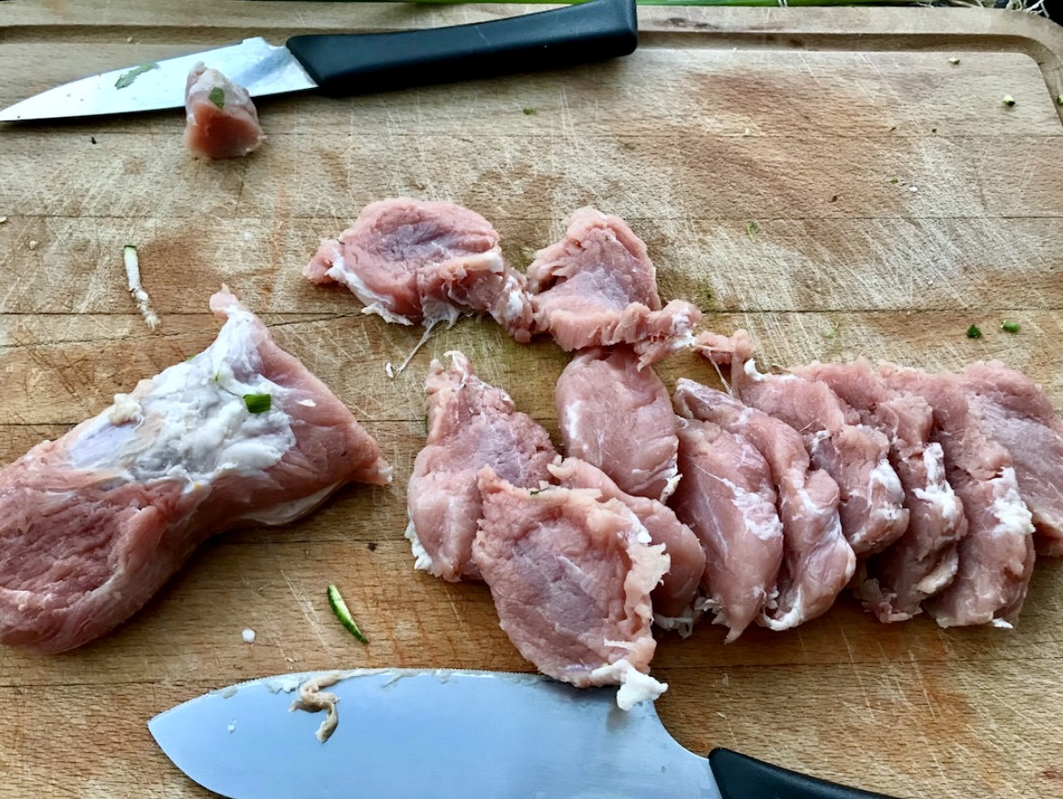 Mięso umyj, osusz ręcznikami papierowymi, a następnie pokrój w cienkie paski.