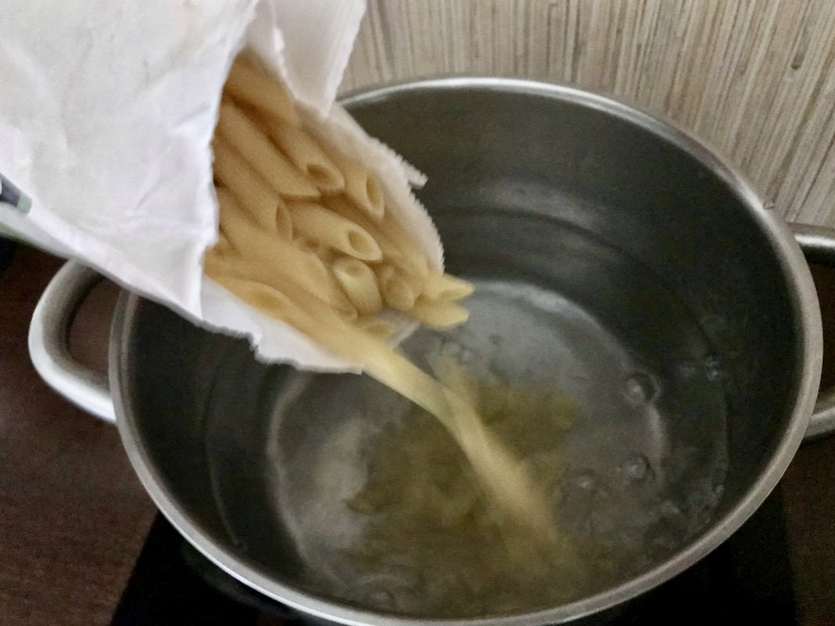Odcedź makaron i wrzuć do niego zawartość patelni. Szybko wymieszaj.