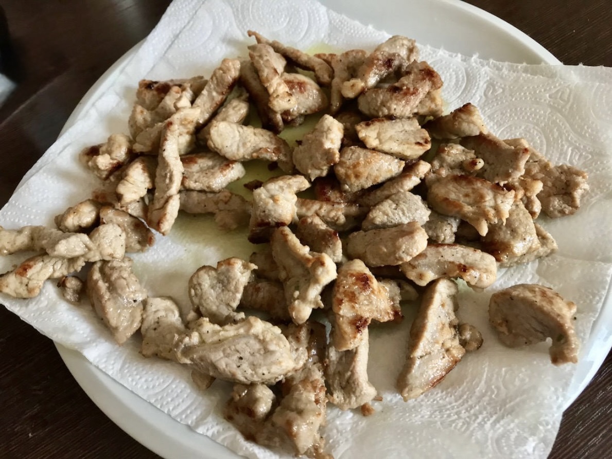 Gdy mięso po kilku minutach zacznie się lekko rumienić, zdejmij je z patelni i przełóż na talerz wyłożony ręcznikami papierowymi.