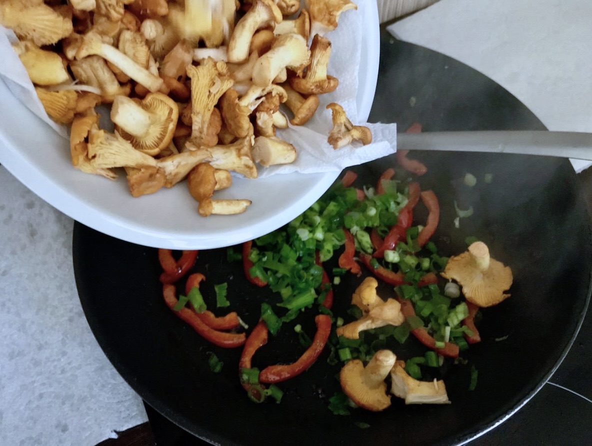Następnie wrzuć kurki. Całość lekko posól i popieprz. Smaż przez 3 do 4 minut.
