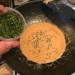 Gotowanie sosu: Wlej połowę puszki mleczka kokosowego, wymieszaj, dodaj liście kaffiru i sok z jednej limonki. Gdy sos nieco zgęstnieje, dolej resztę mleczka.