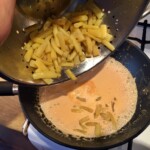 Fasolka: Wrzuć na patelnię fasolkę szparagową i gotuj na średnim ogniu kilka minut, aż sos wyraźnie zgęstnieje, a fasolka zmięknie.